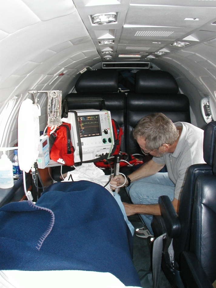 (写真上はチャーター機内。後ろ姿はパラメディックのグレン)